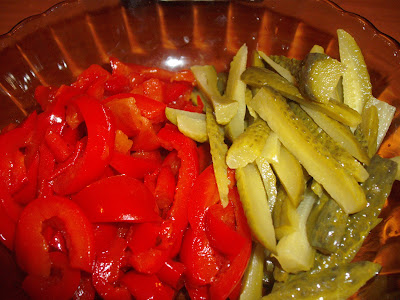 - intr-o tava (teflon, vas yena sau cea antica a "bunicii") se asaza bucatile de carne (nu e nevoie sa ramana spatiu intre ele); "presaram" apoi castravetii si gogosarii; deasupra, ciupercile si piperul macinat (dupa gust)!
